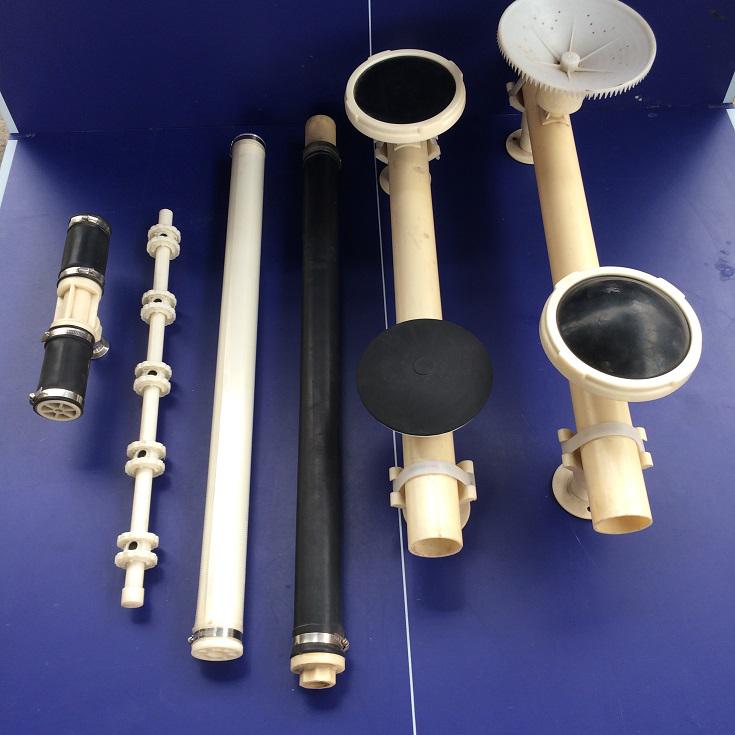 單孔曝氣器又叫單孔膜空氣擴散器也叫單孔膜曝氣器由ABS材料制作成的上、下管夾和配套橡膠膜片組合而成的新型供氣充氧裝著。在曝氣生物濾池工藝中,單孔膜曝氣器通過向濾料層強制輸送高流速的空氣來滿足濾料上的微生物新陳代謝所需要的足夠和穩定的氧份。整個濾池內部的布氣均勻、氣量穩定提高了系統的有機負荷要求。