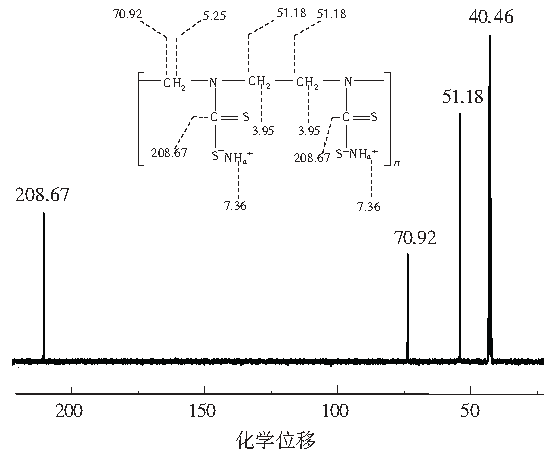 PADTC的1H和13C核磁共振光譜如圖2和圖3所示。在圖2氫譜中,化學位移為5.25、3.95、7.36的峰分別屬于—­­C­­H2、—CH2—CH2和NH4+中的氫。在圖3碳譜中,70.92、51.18和208.67的化學位移屬于—CH2、—CH2—CH2和—S—C═S中的碳。